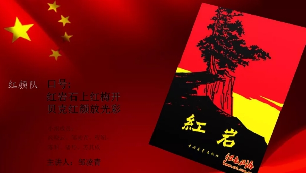 “紅巖石上紅梅開(kāi),貝克紅顏放光彩!”隨著整齊押韻的女聲口號(hào)響起,第一組紅顏隊(duì)的鄒凌青同志開(kāi)始分享《紅巖》讀書(shū)心得,她談到了書(shū)中小蘿卜頭、江姐、許云峰他們鋼鐵般的意志和頑強(qiáng)奮斗的精神;學(xué)習(xí)《紅巖》,我們要學(xué)習(xí)江姐巾幗不讓須眉的奉獻(xiàn)精神,她還結(jié)合工作實(shí)際,“越是困難的時(shí)候,就越需要堅(jiān)定不移的精神去克服和開(kāi)拓!越是荊棘滿(mǎn)布,越是要不畏艱險(xiǎn),迎難而上!”