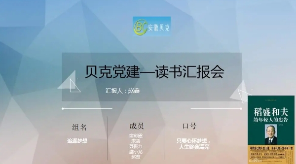 第四組趙鑫同志分享了《給年輕人的忠告》,貝克是聚集了優(yōu)秀的年輕人充滿(mǎn)活力的公司,這本書(shū)也告訴所有的年輕貝克人,無(wú)論什么時(shí)候,我們都要擁有開(kāi)闊的心胸,更要牢記自己心中的理想,遇到挫折的時(shí)候,始終堅(jiān)信只要以正確的態(tài)度面對(duì)這些考驗(yàn),成功就會(huì)離我們?cè)絹?lái)越近。